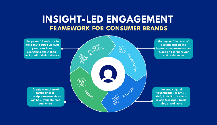 The Insight-led Engagement framework below is a growth flywheel that is aimed at helping consumer brands improve their LTV:CAC ratio. These frameworks go beyond the known precincts of personalizing, engaging, and retaining customer experiences.