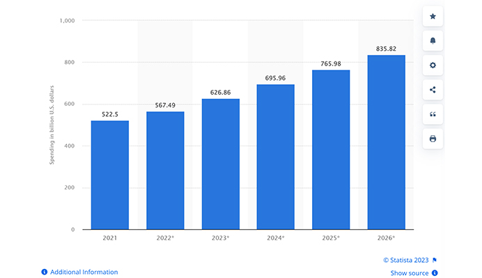 $522.5 billion was spent on digital advertising globally in 2021 over computers, laptops, and mobile devices. Statista states this amount will rise rapidly over the coming years, topping $836 billion by 2026.