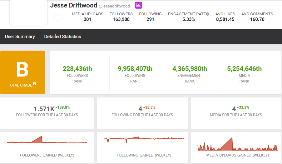 Jesse Driftwood is a macro influencer specializing in photography. According to Social Blade, he has about 163,000 followers and an engagement rate of 5.33%. His posts are highly engaging because they are friendly and personalized.