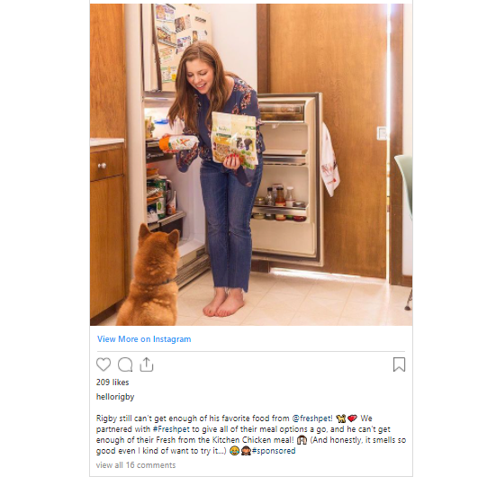 @hellorigby is a leading micro influencer with about 24,000 followers on Instagram. She specializes in fashion, dogs, and lifestyle. Her posts are highly engaging because they appeal to an interested group of food and dog lovers.