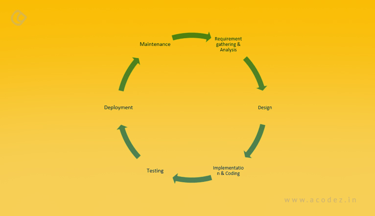 Also known as the linear sequential model, the waterfall model comprises six phases. Each stage follows the other in a sequential manner with the outcome for one phase being input for the next.
