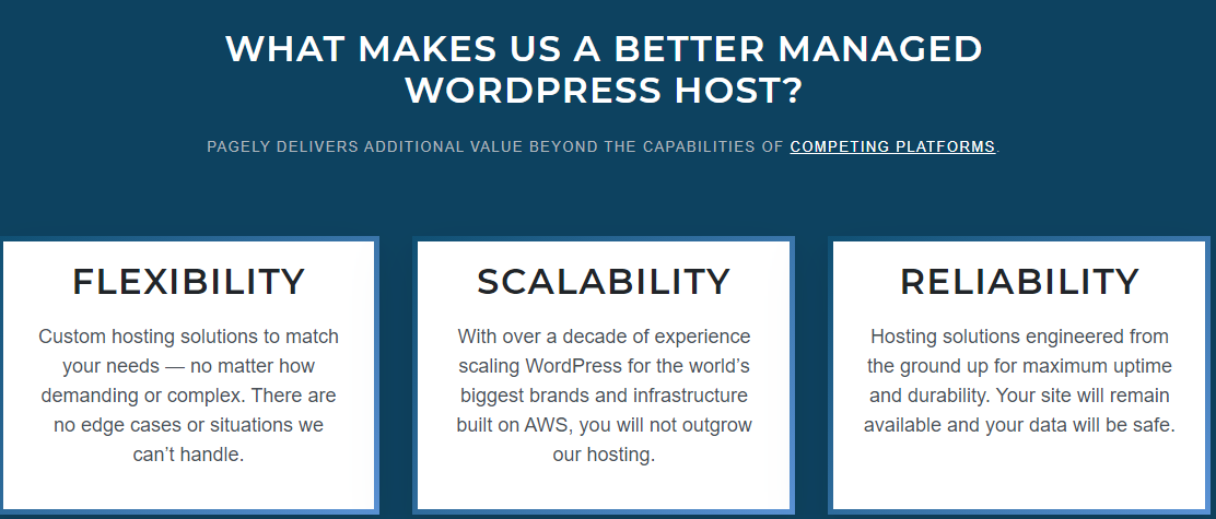 Pagely targets WordPress users by promising to offer a scalable and secure platform. The clear and simple value proposition offers benefits businesses would not get from WordPress.